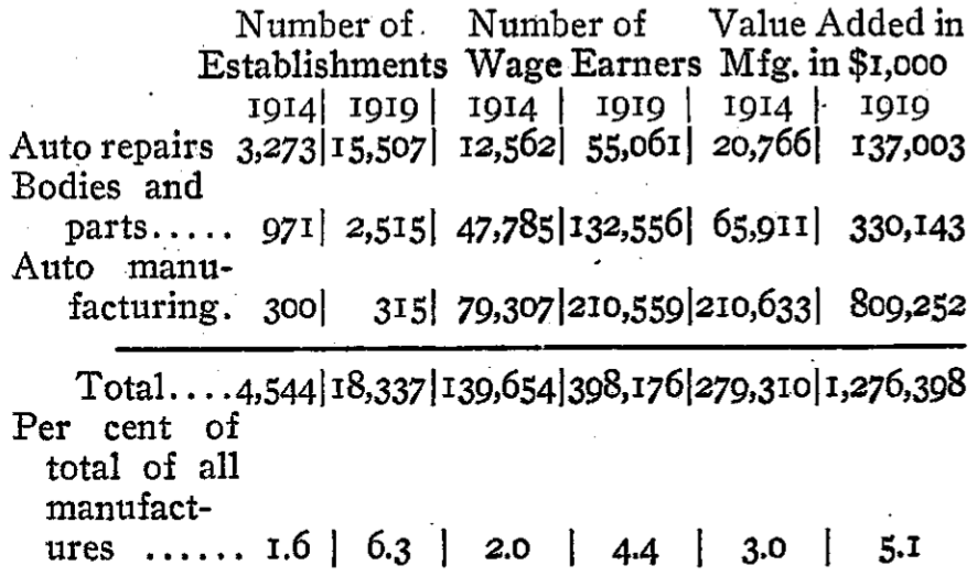 The relative importance and growth of the three main branches of the auto industry are shown in the following table, built up from the U.S. Census figures: