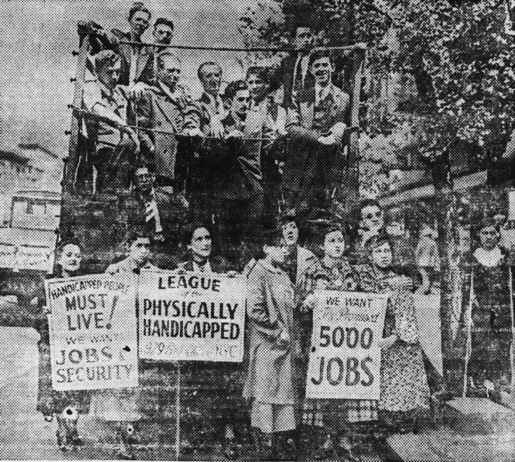 Police line the streets. The pickets file back and forth—many of them use crutches; some have braces or specially-built shoes and drag one foot painfully after the other; several lean on canes. They are mostly young—not many appear over thirty. They carry placards stating their demands for jobs plainly enough: they are all able to work, have all held jobs which they performed with ability and efficiency. Teachers, pharmacists, clerks, watchmakers, bookkeepers, a sprinkling of college graduates. They have been living on Home Relief—the married couples on $4.50 a week, the single on half this amount. They hobble past the office under the eyes of hostile police demanding not charity but work which they are competent to perform—as competent physically as. President Roosevelt, similarly afflicted, is to fulfill the demands on him.