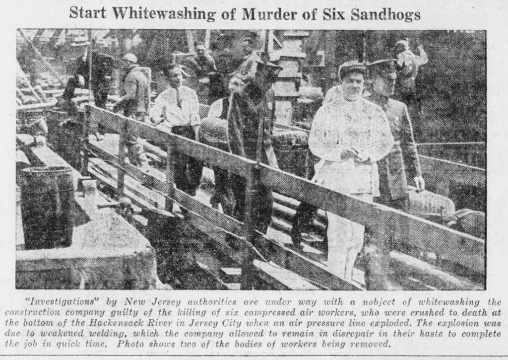 A “sandhog” on the Hackensack River job, in a letter to the Daily Worker last week pointed out the danger of death for these underground “sandhogs,” as workers who work in compressed air, in building tunnels are called. The dangers of this work were exposed in this letter, yet despite the fact that the letter was written over a week ago, conditions remained the same, up to the very time of the disaster which killed the six workers.