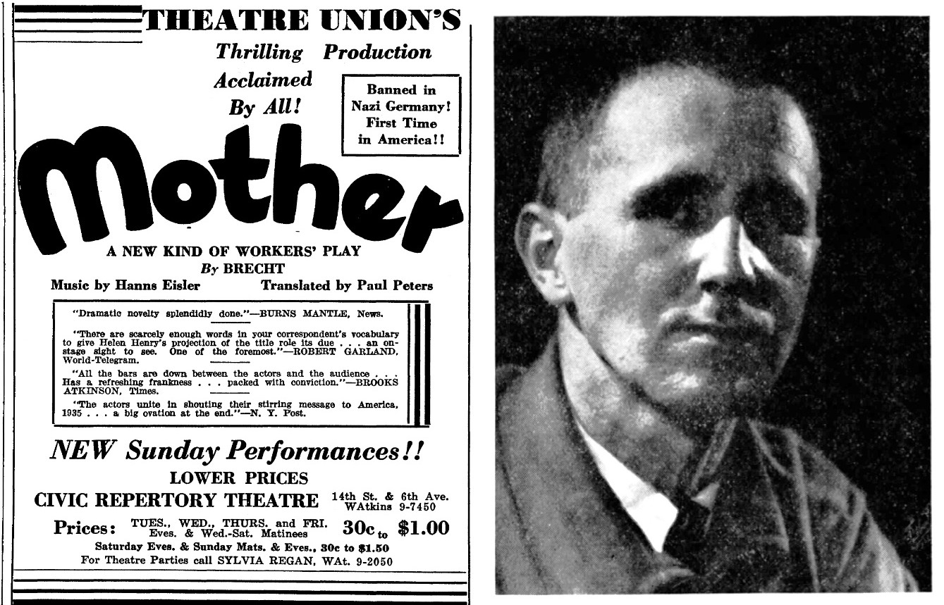 There is actually nothing abstruse about Mother; in fact it is one of the clearest plays imaginable. “Take some Agit-prop, add a bit of Piscator and Meyerhold and a Greek chorus—put them all together and they spell Mother,” somebody wise-cracked half-seriously. And the authors, Bert Brecht and Hanns Eisler, would heartily agree that they have drawn on every source which offered suggestions and materials for their adaptation of Gorky’s classic novel. But they would insist on explaining the basic principle which shaped every instant of their play. Brecht would point out that Mother differs from other drama because it is a “learning play” and as such belongs to his “epic theater.”