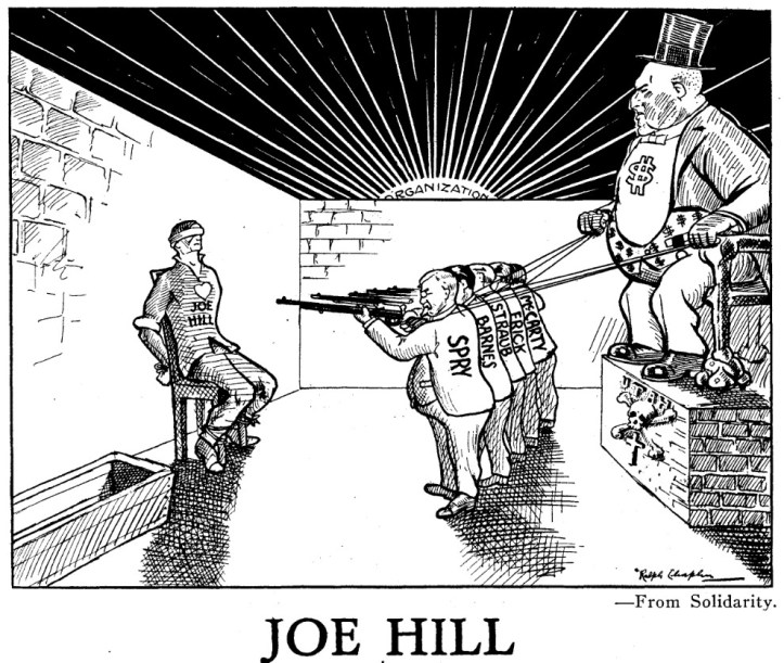 Let his blood cement the many divided sections of our movement, and our slogan for the future be: “Joe Hill’s body lies mouldering in the grave, but the cause goes marching on.”