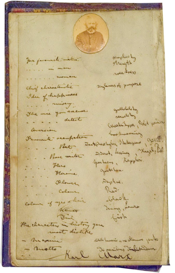During one of my conversations with Laura about her father (I cannot now recall in what connection), I said it was a great pity that there was so little “subjective” material among Marx’s posthumous papers. Laura suddenly remembered that she and her elder sister, Jenny, had once made their father answer a set of questions, this game of “Confessions” being popular at the time. By good fortune, she was able to put her hand on the document, and she gave me a copy of it, which I reproduce here.