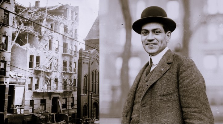 An ill Flynn made it a point to speak at the funeral of those many on the left and in the workers’ movement repudiated at the time. On July 4, 1914 Quebec-born Arthur Caron along with fellow revolutionary anarchists Charles Berg and Carl Hanson were killed in an explosion at their 1626 Lexington Avenue apartment in New York City. Along with them, an uninvolved tenant, Marie Chavez, was also killed and twenty people were injured. Said to be a premature detonation of dynamite meant to assassinate John D. Rockefeller in retribution for the Ludlow Massacre of twenty strikers and their families, including 12 children, three months before, the event split the left with many, including in the I.W.W., of which the three were members or associates, distancing themselves in the aftermath.