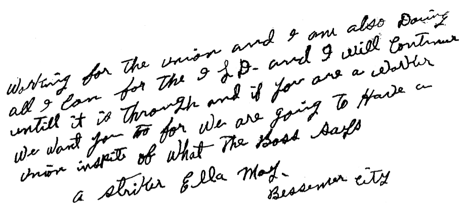 But what buts them is that it only makes us stronger. If I had not already belonged I would join now. But I joined when it first came down here and I am not ashamed of it. I can’t speak to do any good, but I try. And I do anything else I can to benefit myself and other workers. And if every one of the workers could see it as I can, we would have no trouble winning, and I hope whoever was in that mob of thugs last night will have to suffer. But we cannot look for the law to punish their own bunch.