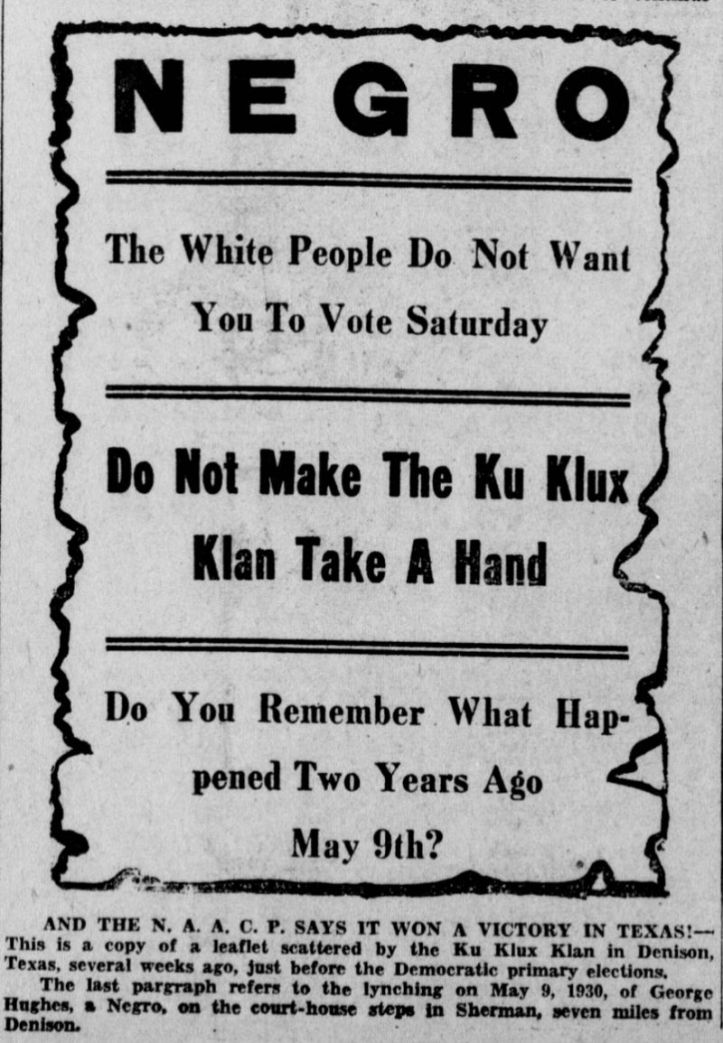 Texas: In Houston, election judges refusing to admit Negroes to the polls were backed up by the police. At Sherman, a flaming cross warned Negroes in the name of the Klan to keep away from the voting booths.